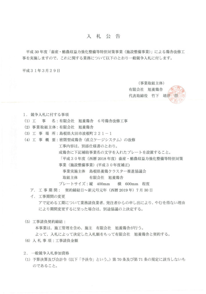 • 事業取組主体 :有限会社 旭養鶏舎