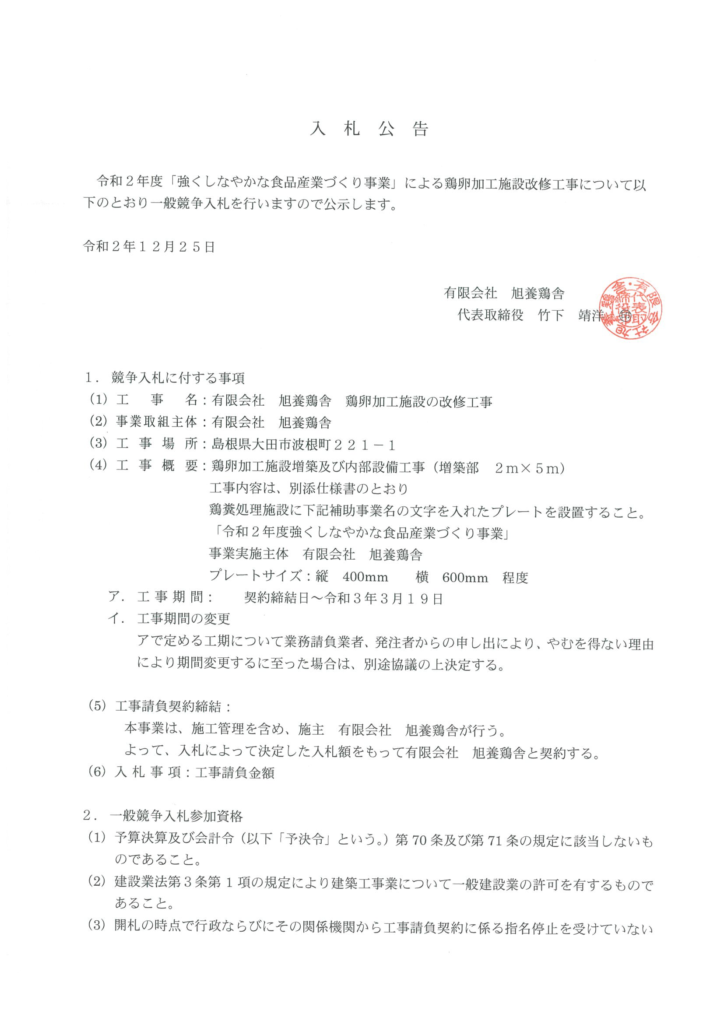 • 工事名   :有限会社 旭養鶏舎 鶏卵加工施設の改修工事